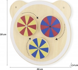 Tabla din lemn cu simpatica față de ursuleț transformă orice colțișor pentru copii într-o zonă de joacă creativă. Cele trei rotițe colorate pot fi rotite cu ușurință pentru a observa impresionantele efecte optice, care îi captivează pe copii și îi motivează să exploreze mai departe. Tabla este ideală pentru camera copilului, grădinițe și spații de joacă.