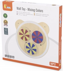Trei rotițe ușor de învârtit, în culori de bază, creează la rotire modele captivante. Copiii învață să recunoască culorile și să perceapă mișcarea și ritmul într-un mod jucăuș.