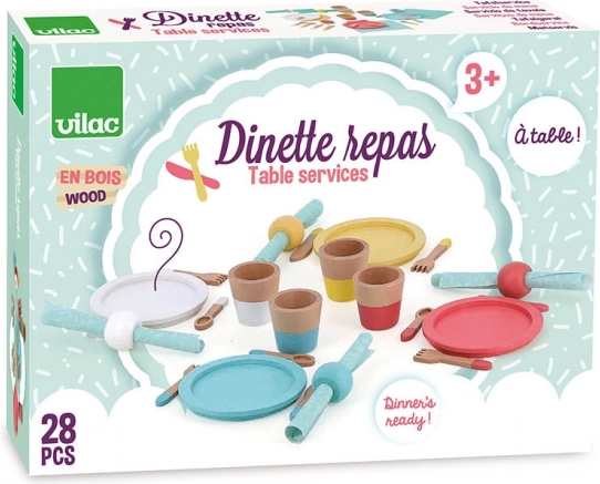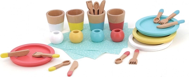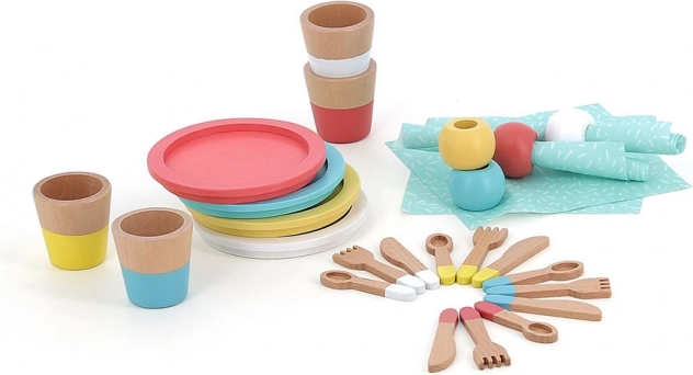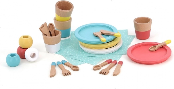Acest set de masă din lemn le oferă copiilor o experiență autentică de bucătărie de jucărie. Farfuriile, paharele, lingurițele, furculițele și cuțitele colorate, împreună cu șervețelele și inelele, inspiră jocul de rol, dezvoltă motricitatea fină și susțin colaborarea și comunicarea între copii.