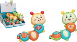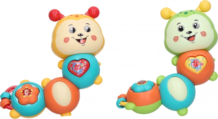 Atrăgătoare zornitoare în formă de omidă, cu o lungime de 14 cm, oferă efecte luminoase și sonore, inclusiv melodii care captează atenția fiecărui copil.