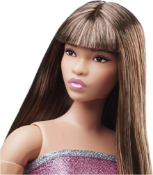 Păpușa Barbie are păr șaten mătăsos cu breton drept, sprâncene accentuate și machiaj strălucitor, care completează aspectul său.