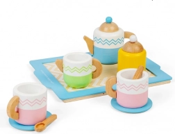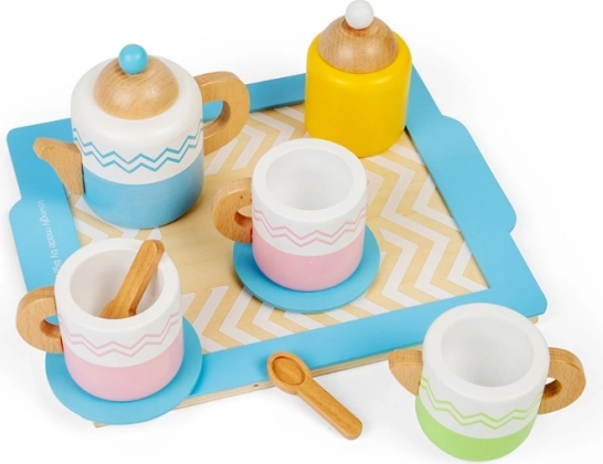 Acest set bogat pentru ceai oferă tot ce au nevoie micile gazde – de la cești până la ceainic și tavă. Execuția din lemn de calitate, finisajele netede și culorile pastelate delicate invită la joacă, care dezvoltă imaginația, comunicarea și regulile de bază ale servirii mesei.
