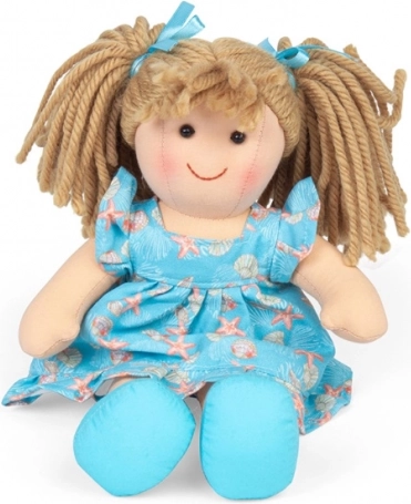 Păpușa din material textil Maisie este concepută cu accent pe siguranță, confort și durabilitate. Datorită corpului textil moale este ideală pentru îmbrățișări și joaca de zi cu zi. Zâmbetul vesel și rochița albastră cu motive marine îi vor cuceri pe copii pe loc.