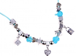 - 3 brățări din plastic, 2 șnururi (roz, albastru), mărgele roz și albastre, pandantive charms argintii