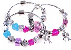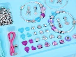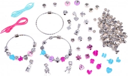 Setul include 3 brățări din plastic, 2 șnururi colorate, mărgele roz și albastre și pandantive charms argintii – trebuie doar să începi să creezi.