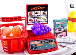 Copiii pot experimenta cumpărături adevărate – bipul scannerului, plata cu „bancnote” și eliberarea produselor de pe tejghea sporesc autenticitatea jocului.