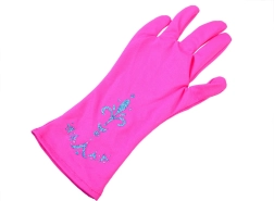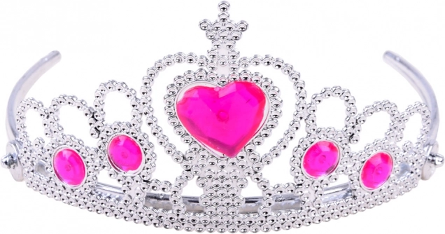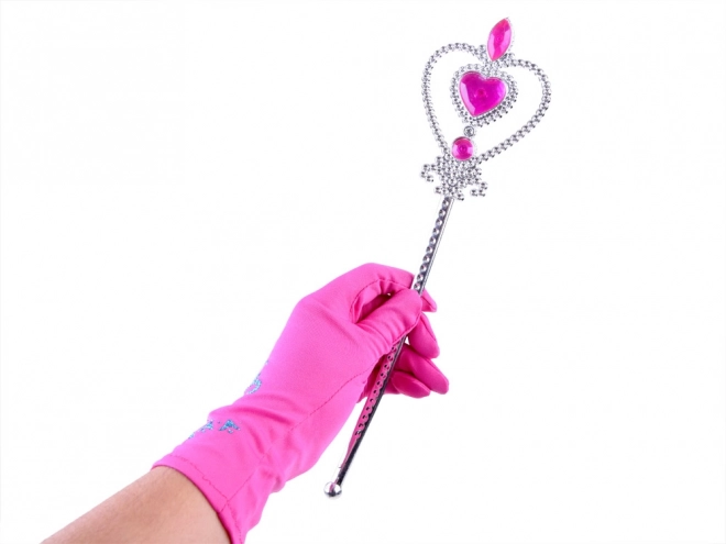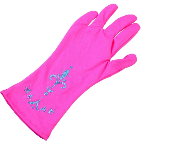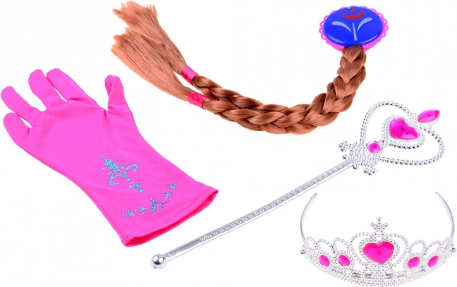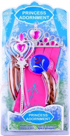 Clemă de păr decorativă de culoare albastru închis cu cosițe lungi castanii, se aplică ușor și ajută la o asemănare cu o frumoasă prințesă dintr-o poveste preferată. Coroana și sceptrul sunt un accesoriu indispensabil pentru orice regină sau prințesă, fiind stilizate și frumos decorate cu cristale de plastic roz. Mănușa roz cu o decorație elegantă completează perfect ținuta micii fete.