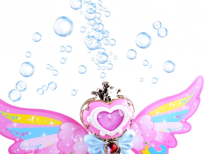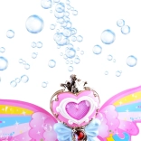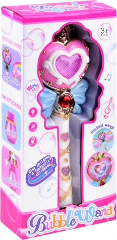 Butonul de pe baghetă nu doar lansează bule colorate, dar și lumini strălucitoare care adaugă o atmosferă magică.