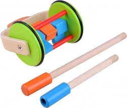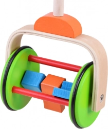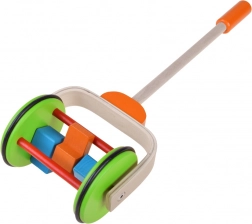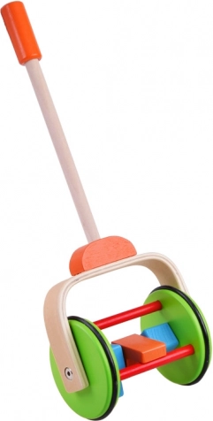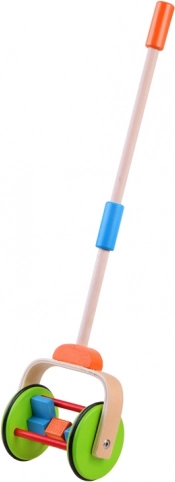 Jucăria de lemn colorată pentru împins este proiectată pentru a sprijini copiii la primii lor pași. Are un mâner ajustabil pe înălțimea copilului. Roțile sunt acoperite cu o bandă de cauciuc, asigurând o mișcare lină și protecția podelei.