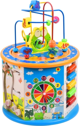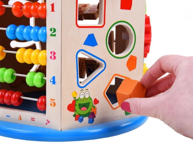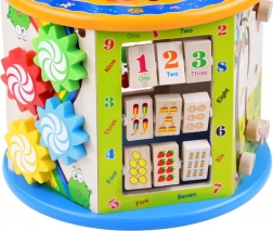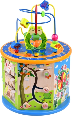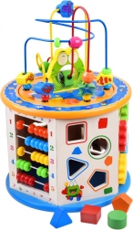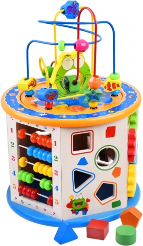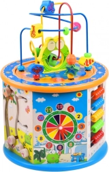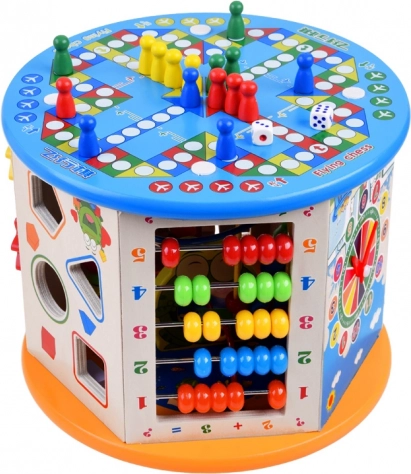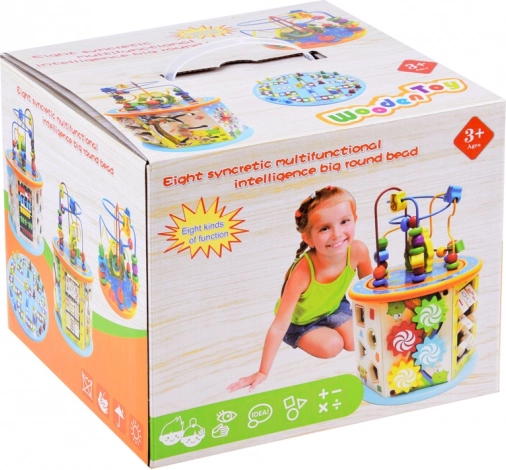 Cub educațional din lemn 8-in-1 este o jucărie multifuncțională pentru copii, care îmbină elemente educaționale și distractive. Permite dezvoltarea abilităților motorii și susține capacitățile cognitive ale copiilor prin joc interactiv.