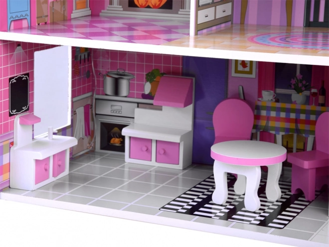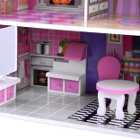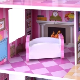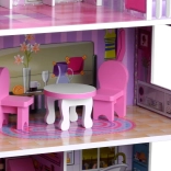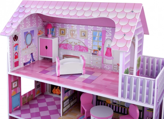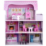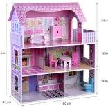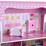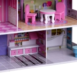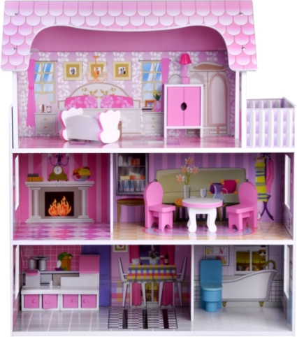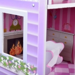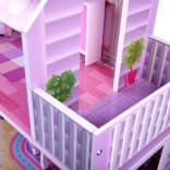 Căsuța din lemn în nuanțe roz–mov cucerește prin ilustrații detaliate și arhitectura deschisă, pentru acces facil în fiecare cameră. Cele trei etaje oferă cinci zone complet echipate și o terasă, invitând la ore întregi de joc imaginativ. Datorită construcției din lemn stabile și proporțiilor bine gândite, este centrul ideal al camerei copilului.