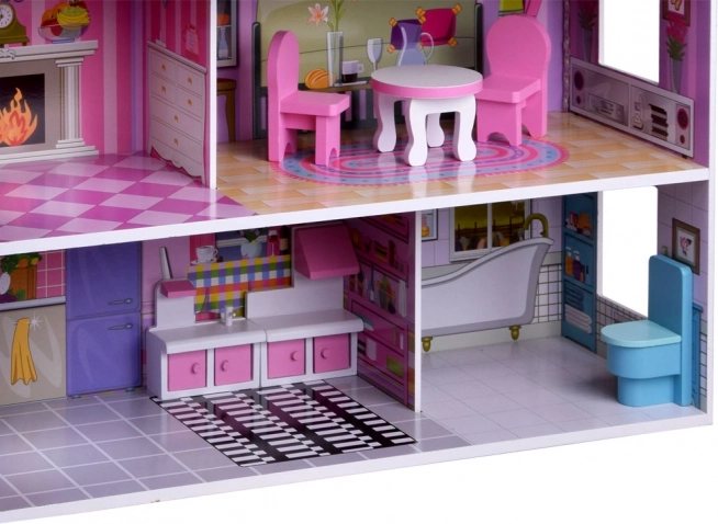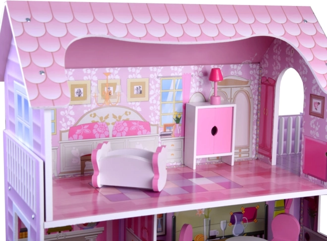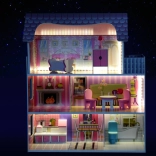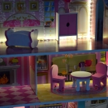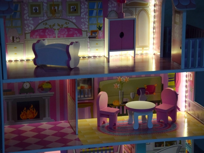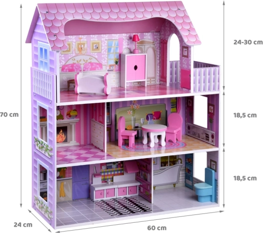 Elegantă căsuță din lemn pentru păpuși cu 3 etaje și 5 încăperi, un set bogat de mobilier și o iluminare LED delicată. Construcție solidă, dimensiuni 70 × 60 × 24 cm și asamblare ușoară în 30 de minute, ideale pentru joacă creativă cu păpuși tip BARBIE și ANLILY.