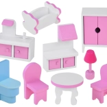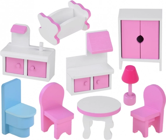 - Set de mobilier: bufet cu hotă și uși care se deschid, dulăpior de baie cu uși, toaletă albastră, masă rotundă albă, 2 scaune roz, dulap alb cu uși roz, leagăn, veioză și lumini LED.