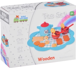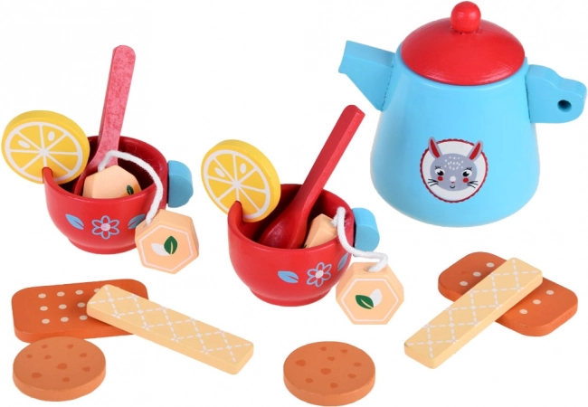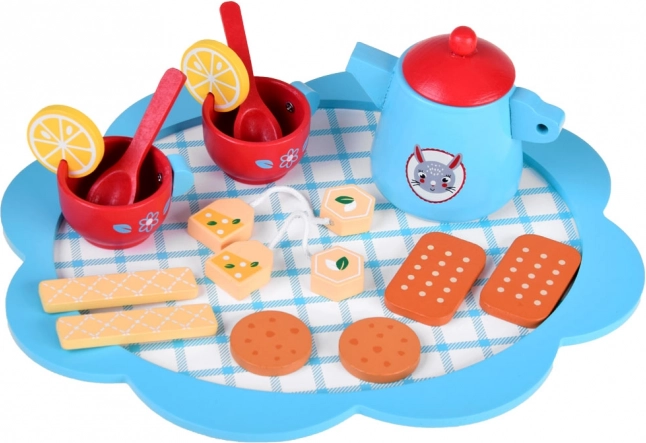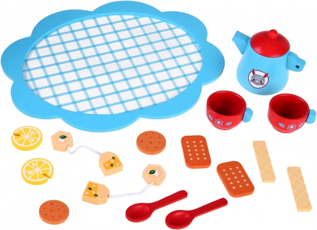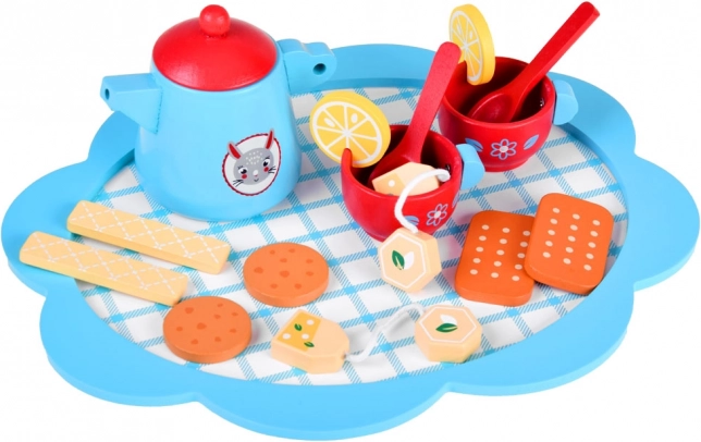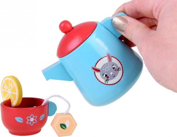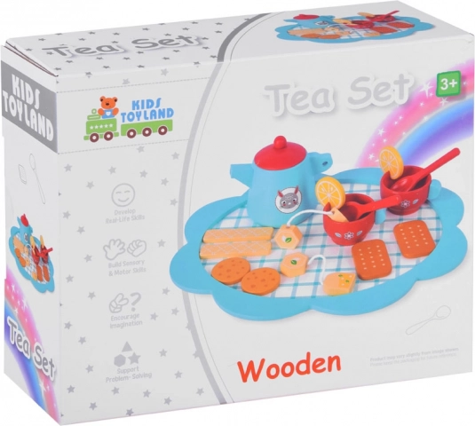 Acest elegant set de ceai din lemn masiv îi va încânta pe toți micii amfitrioni și amfitrioane. Nuanțele delicate de albastru și roșu, motivele drăguțe și dotarea bogată susțin jocul creativ, abilitățile sociale și percepția senzorială. Copiii pot servi ceai cu lămâie, pot oferi biscuiți și își pot exersa politețea la masă.