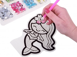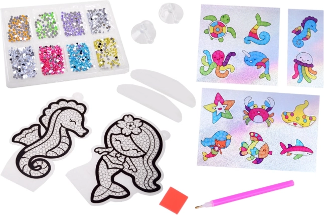 Creați autocolante sclipitoare și două tablouri suspendate cu prietenii mării. Creațiile finalizate pot fi așezate pe suporturi sau agățate cu ventuze cu cârlige.