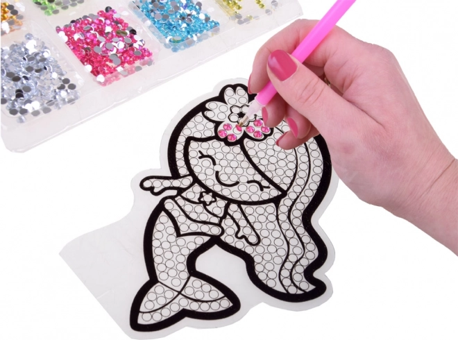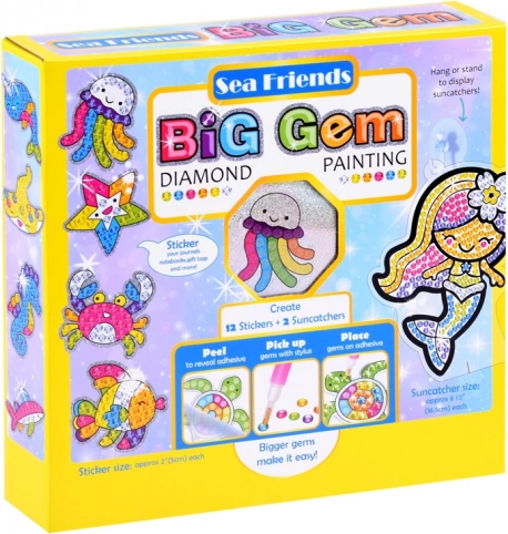 Acest set Pictură cu diamante Sea Friends le permite copiilor să creeze imagini strălucitoare cu prietenii marini. Este suficient să dezlipești folia de protecție, să iei o pietricică cu aplicatorul cu ceară și, după culori, să o așezi pe autocolant sau pe șablonul cu adeziv. Dacă o pietricică este lipită greșit, o poți repoziționa cu ușurință înainte să se usuce.