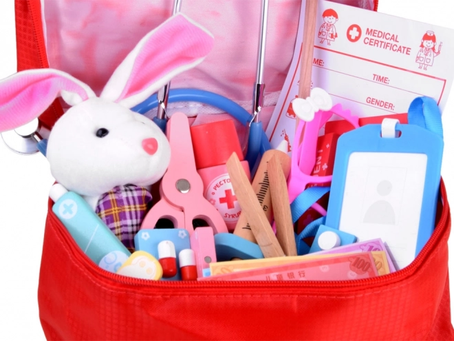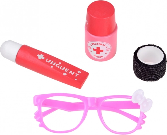 Sunt incluse și termocuplu/termometru cu discuri interschimbabile, seringă, foarfecă, pensetă, bandaj, plasturi, șnur, legitimație de medic, fișă de pacient și carnet medical, „medicamente” sub formă de pastile și capsule (recuzită), sirop și unguent în tub. Totul se depozitează ușor în trusa roșie rezistentă cu mâner, fiind ideală pentru călătorii și intervenții rapide.