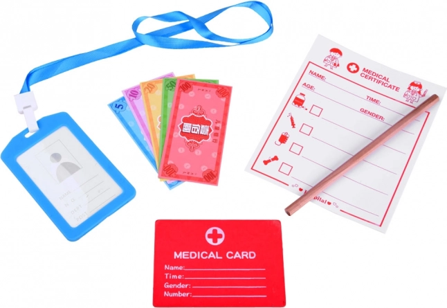 Acest set medical cu multiple componente este conceput pentru un joc sigur și inspirativ. Instrumentele din lemn sunt plăcute la atingere, robuste și atrăgătoare cromatic; din plastic sunt doar legitimația și ochelarii. Atracția principală este stetoscopul metalic cu furtun din cauciuc, care, aplicat pe piept, permite auzirea bătăilor inimii – exact ca la un medic adevărat.