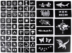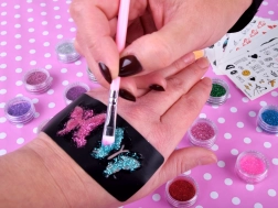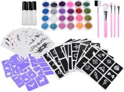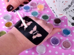 Aplicare simplă, pas cu pas: alegeți șablonul, lipiți-l pe pielea curată, acoperiți motivul cu adeziv, îndepărtați șablonul, lăsați să se usuce puțin și presărați sclipiciul colorat. Scuturați surplusul – gata! Totul este depozitat într-o cutie practică și colorată pentru o stocare ușoară.