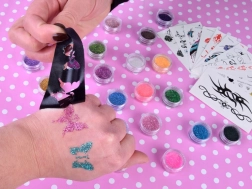 Setul creativ mare pentru tatuaje cu brocart și cu apă transformă orice petrecere într-o experiență. Datorită gamei largi de șabloane și sclipiciului colorat, copiii își creează tatuaje temporare originale, care rezistă la câteva băi și apoi dispar ușor.