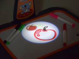 Proiectorul oferă două moduri: ca proiector pentru afișarea imaginilor sau ca lampă. Este suficient să schimbi funcția prin glisarea butonului. Setul include 48 de imagini diferite pe 6 șabloane circulare. Imaginile sunt împărțite în categorii precum vehicule, legume, fructe, animale, sport și îmbrăcăminte, garantând ore întregi de distracție. Modelele proiectate pot fi desenate pe o suprafață dry-erase sau pe hârtie obișnuită.