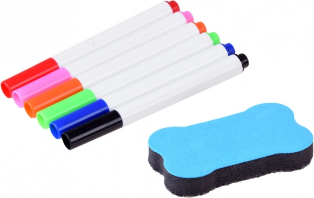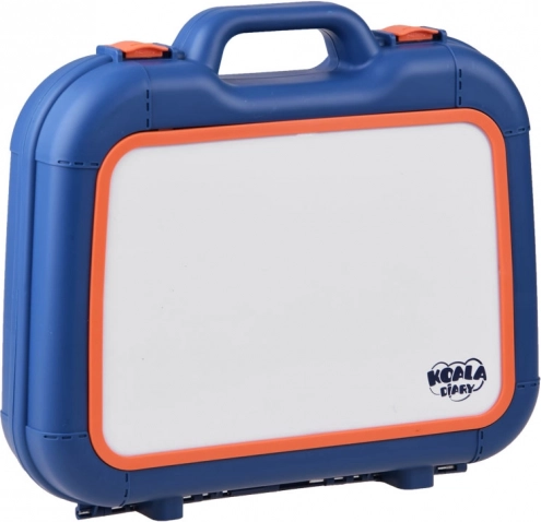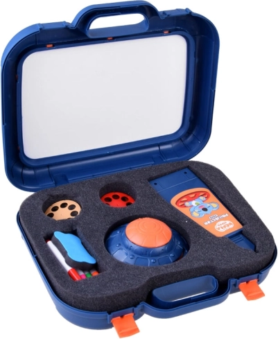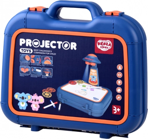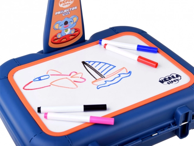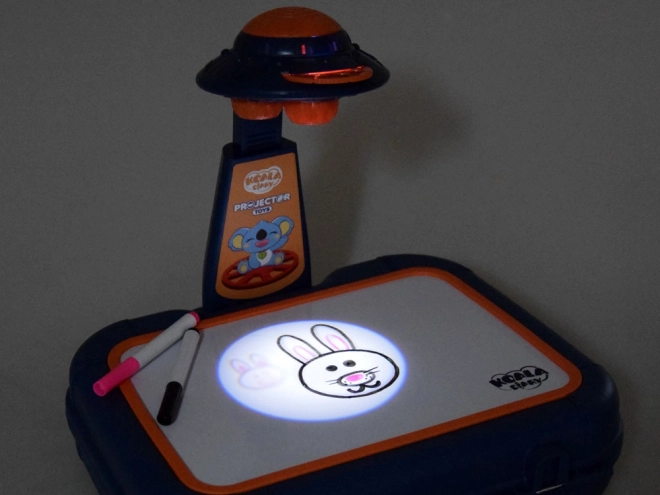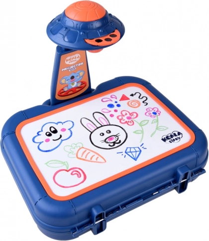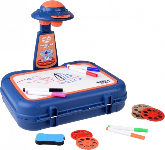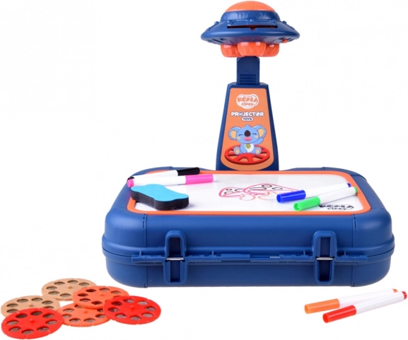 Valiză cu suprafață de desen, proiector-lampă, braț ajustabil, 6 șabloane cu imagini, burete pentru șters și 6 markere.