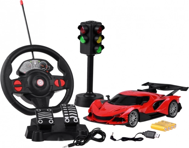 În pachet găsiți totul pentru distracție: mașină RC, volan, pedale, semafor, acumulator reîncărcabil și cablu USB pentru încărcare.