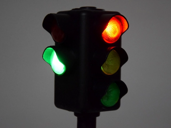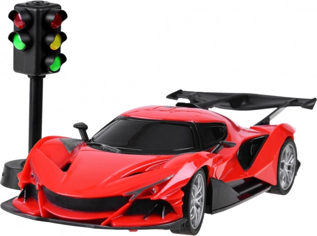 În pachet este inclus și un semafor, care îmbogățește jocurile cu elemente de trafic și îi învață pe copii bazele regulilor de circulație. Mașina este realizată din plastic rezistent, are tracțiune pe puntea spate și convergență reglabilă a roților din față pentru o rulare mai stabilă.