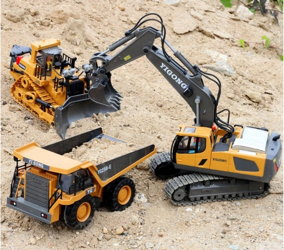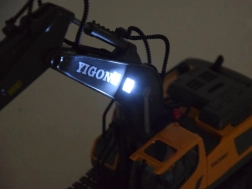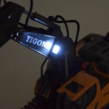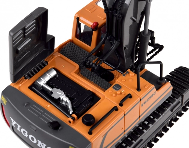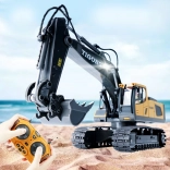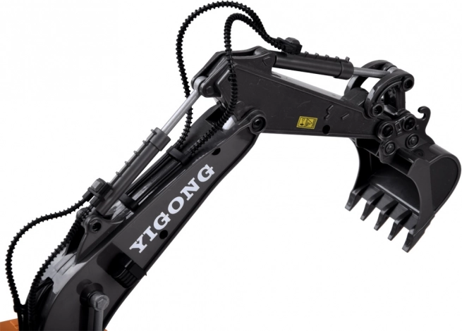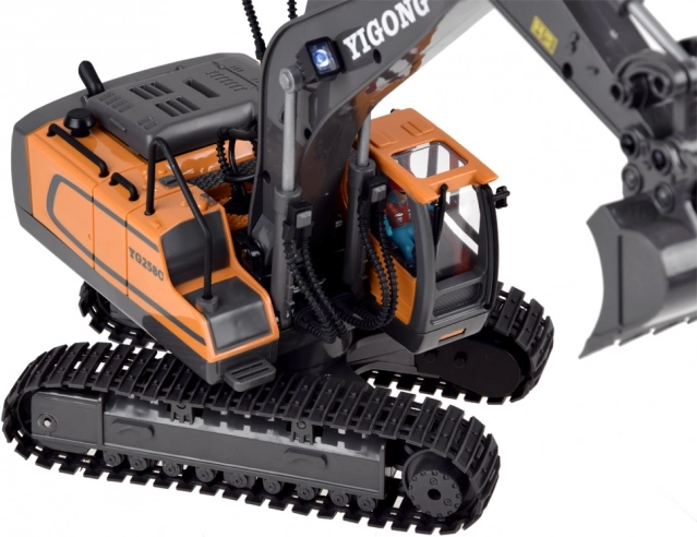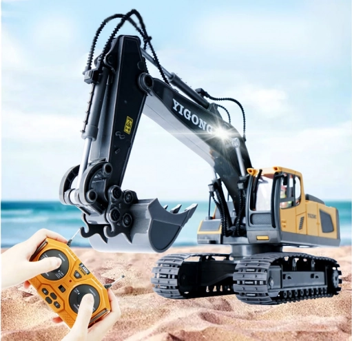 Acest excavator RC la scară de jucărie impresionează prin execuția precisă și plasticul rezistent. Datorită șenilelor din cauciuc se deplasează sigur chiar și pe suprafețe neregulate, brațul se ridică și coboară, iar cupa ia material ca în realitate. LED-urile și sunetele motorului accentuează experiența realistă.