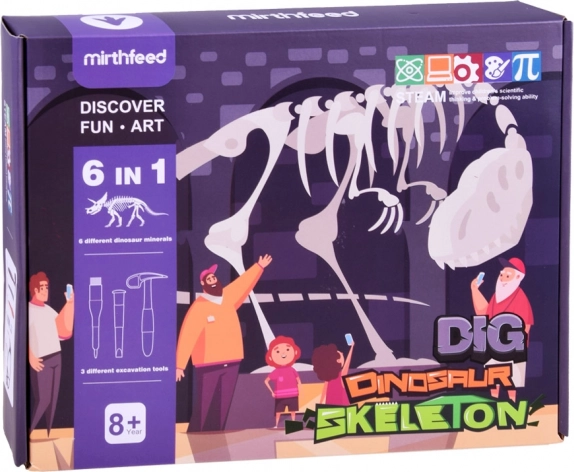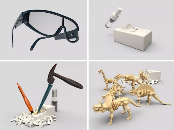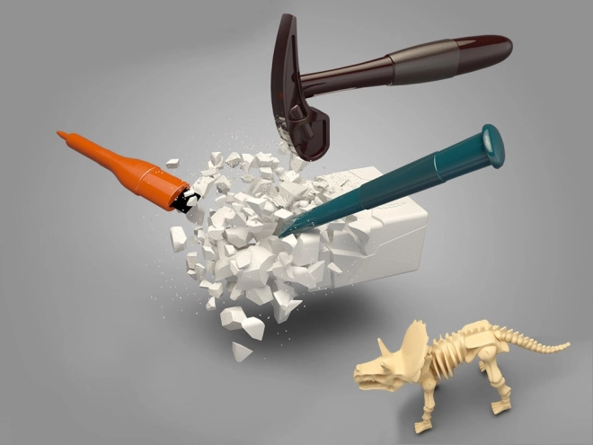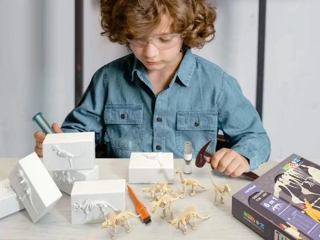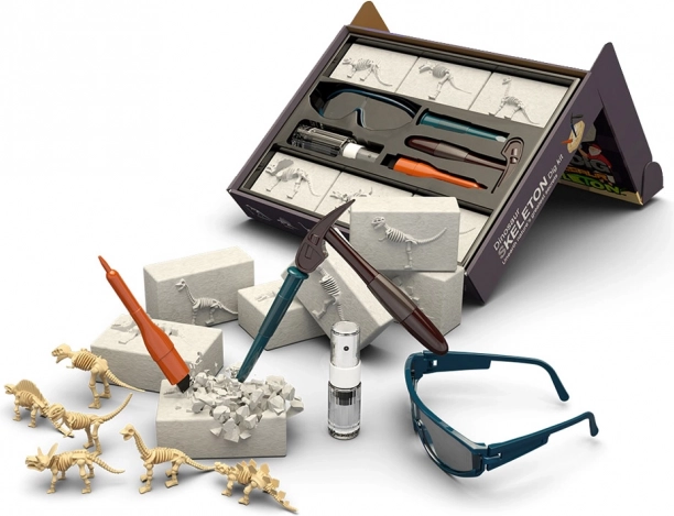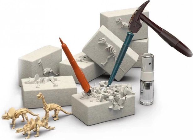 Descoperă lumea preistoriei cu acest set educativ și distractiv pentru micii arheologi. Cu ajutorul ciocanului, dălții, pensulei și pulverizatorului, copiii eliberează cu grijă din blocurile de gips scheletele a 6 dinozauri diferiți și le asamblează în modele. Setul stimulează motricitatea fină, gândirea logică și curiozitatea și, datorită ochelărilor de protecție, oferă o experiență paleontologică sigură și realistă.