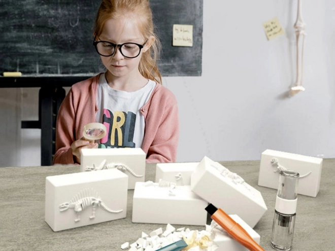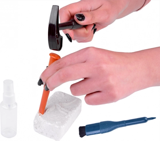 Setul simulează munca arheologică reală: umezire, descoperire, curățare și asamblare. Copiii învață răbdarea și atenția într-un mod sigur.