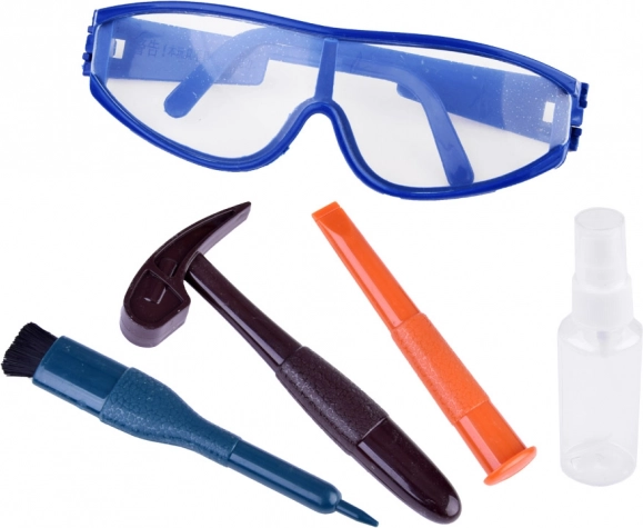 Daltă, ciocan, pensulă, pulverizator și ochelari de protecție – un kit complet pentru micii exploratori, care susține motricitatea fină și coordonarea.