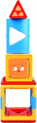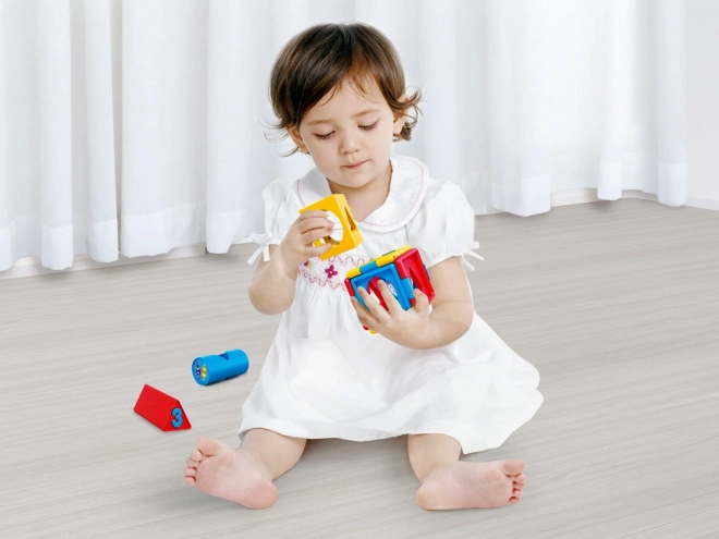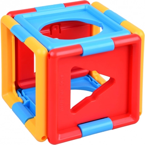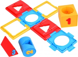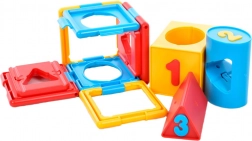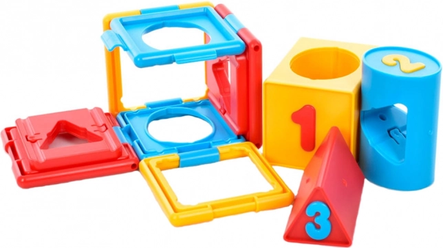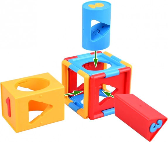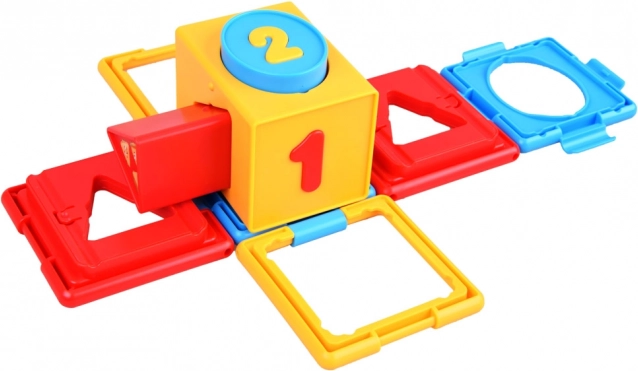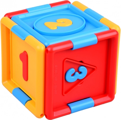 Cubul conține forme și numere variate, ceea ce ajută la învățarea formelor și numerelor de bază.