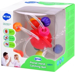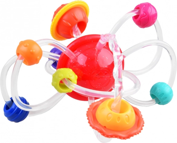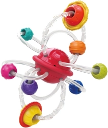 Descoperiți jucăria de dentiție din silicon 2 în 1 cu planete și inele, care oferă alinare la apariția dinților și în același timp stimulează simțurile. Această jucărie este echipată cu o planetă roșie rotativă, de la care pornesc tuburi flexibile din silicon cu inele multicolore care conțin diverse proeminențe, ce ajută la masarea gingiilor iritate ale copilului dumneavoastră.
