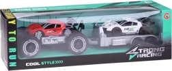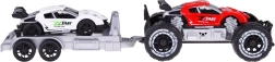 Mașină de teren și mașinuță sport cu remorcă oferă distracție pentru fiecare mic fan al automobilismului. Mașinuțele sunt fabricate din plastic, iar remorca este ideală pentru transportul mașinii sport la curse.