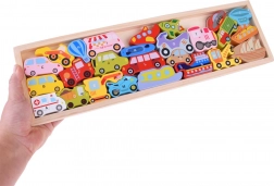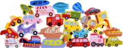 Datorită execuției robuste din lemn masiv, piesele sunt plăcute la atingere și sigure în timpul jocului. Copiii pot asambla puzzle-ul pe placă, construi turnuri, număra și inventa povești cu mijloacele de transport preferate.