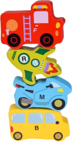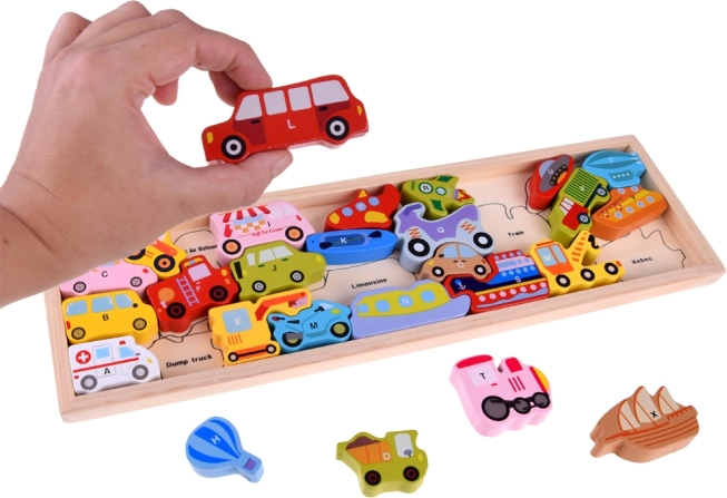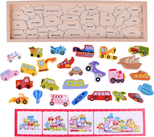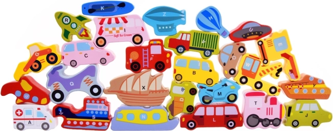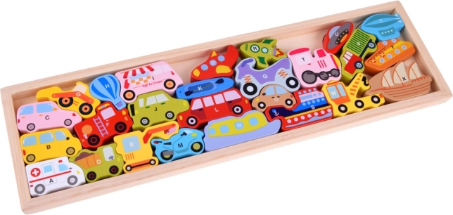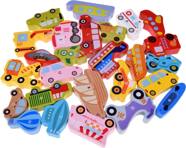 Acest set din lemn conține 27 de vehicule colorate – de la mașină, autobuz și autospecială de pompieri până la balon, barcă, rachetă sau aeronavă mai ușoară decât aerul – și o placă din lemn cu denumiri marcate. Fiecare piesă poartă o literă A–Z (inclusiv un motiv special), ajutând copiii să învețe alfabetul într-un mod distractiv și să își îmbogățească vocabularul.