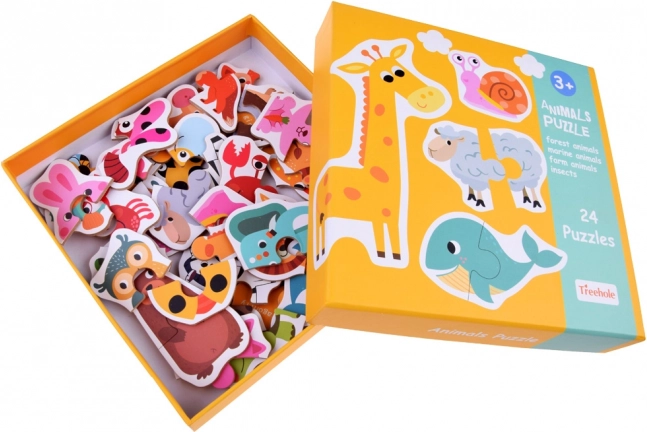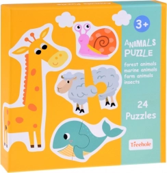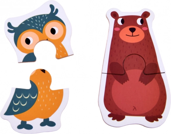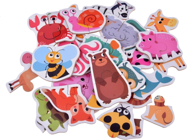Acest set vesel include ilustrații drăgălașe cu animale din safari, pădure, curte, pajiște și apă. Fiecare motiv este alcătuit din două piese mai mari, ușor de ținut și de îmbinat de către copii. Datorită principiului simplu, copiii își dezvoltă rapid încrederea și bucuria reușitei.