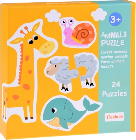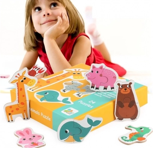 Descoperiți un set distractiv pentru cei mici: 24 de puzzle-uri simple din două piese cu animale, care susțin motricitatea fină, gândirea logică și memoria vizuală. Fiecare imagine este colorată și clară, ideală pentru copiii de la 3 ani. Pe verso-ul pieselor se află denumirile animalelor în limbi străine pentru învățarea naturală a vocabularului în timpul jocului.
