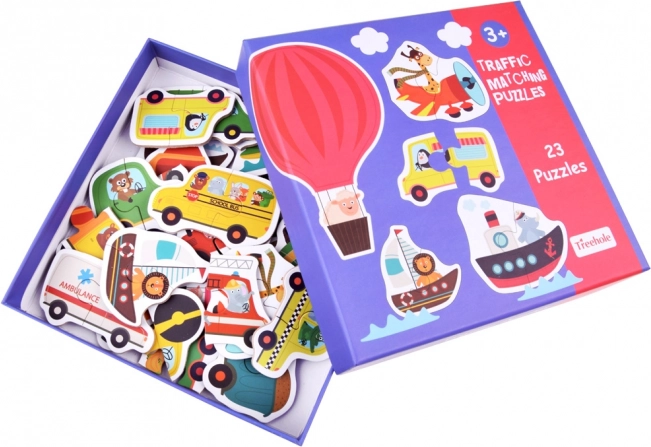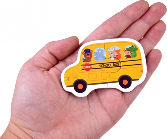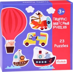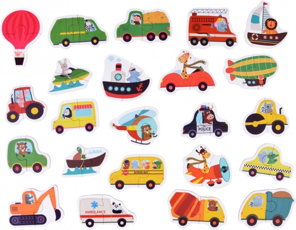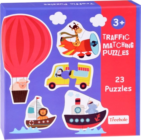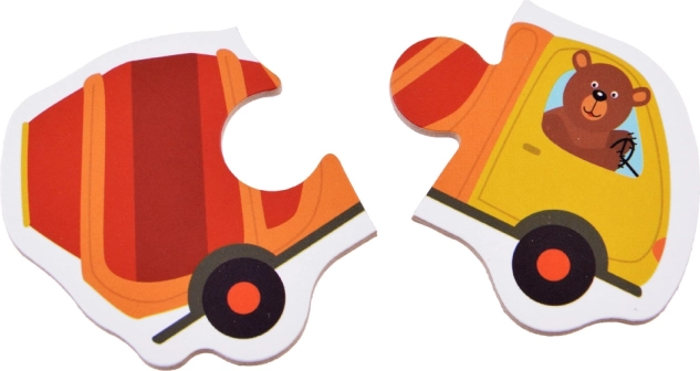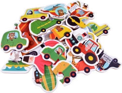 Acest set creativ conține 23 de puzzle-uri simple în două piese, cu ilustrații vesele din lumea transportului – de la mașini și utilaje de construcții la poliție și pompieri, până la avioane, bărci și balon. Puzzle-urile ideale pentru micii exploratori, care își exersează coordonarea mână–ochi și recunoașterea formelor, culorilor și tipurilor de vehicule.