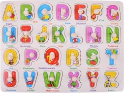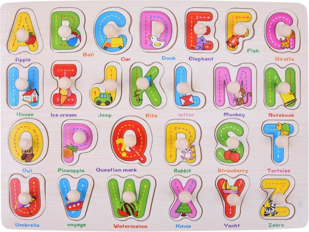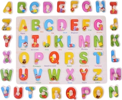 Acest alfabet din lemn este un ajutor excelent pentru primele întâlniri cu literele. Piesele mari, colorate, cu mânere din lemn se scot și se introduc ușor, dezvoltând în mod natural coordonarea mână–ochi și motricitatea fină. Fiecare literă are o imagine și un cuvânt în engleză (de ex. A – Apple, B – Ball, R – Rabbit), astfel încât copiii învață simultan literele și vocabularul de bază.