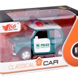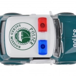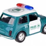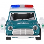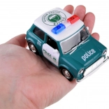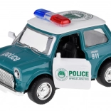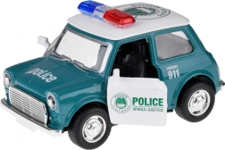 Miniatura de mașină de poliție cu design clasic oferă detalii realiste, inclusiv girofaruri roșii și albastre și inscripții de poliție vizibile. Caroseria metalică și roțile din cauciuc măresc durabilitatea și aderența, astfel încât mașinuța este ideală pentru joaca de zi cu zi acasă sau în deplasare.