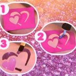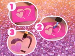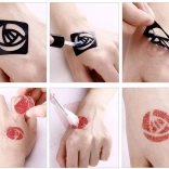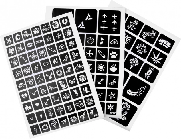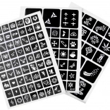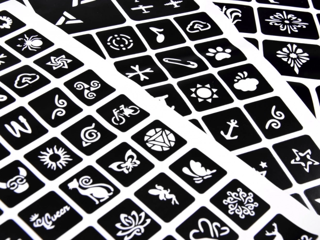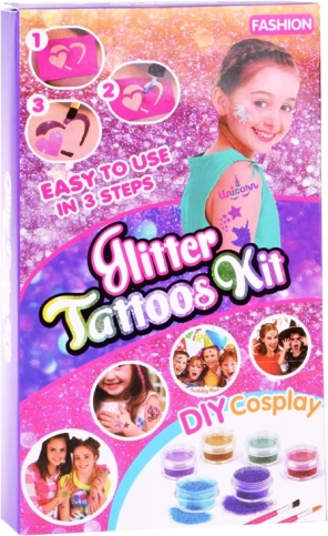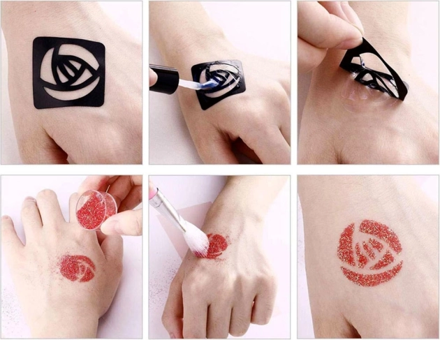 Instrucțiuni: Alege șablonul și lipește-l pe pielea curată, aplică modelul cu adeziv, dezlipește șablonul, adaugă culorile de sclipici și gata!