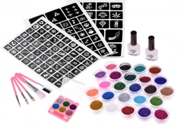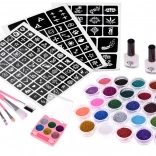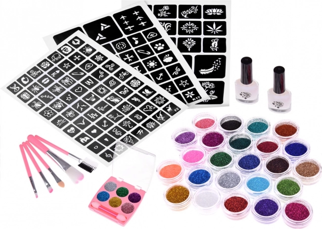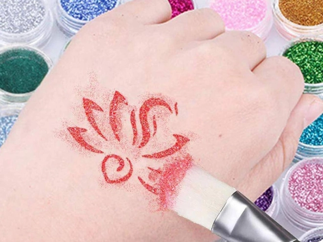 Kitul include tot ce ai nevoie pentru a crea tatuaje sclipitoare uimitoare, cu 24 de culori diferite de sclipici.