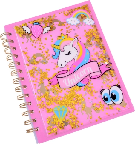 Notebook-ul cu fundal roz și sclipici auriu se remarcă prin designul său magic, care te atrage la scris și desenat.