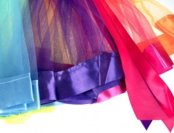 Punctul culminant este fustița inspirată de culorile curcubeului, realizată din tul multistrat și finisată cu o panglică de satin.
