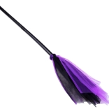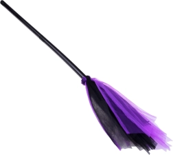 Mătura ușoară, cu mâner din plastic și terminații negru-mov, este ideală ca recuzită pentru carnaval și costume de Halloween.