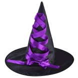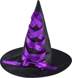 Pălăria neagră de vrăjitoare este decorată cu o panglică satinată mov. Forma fermă și contrastul puternic al culorilor subliniază look-ul magic.