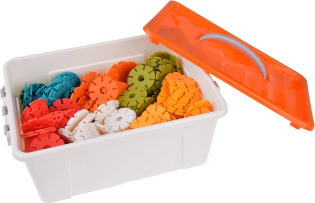 Cutia de plastic cu capac și mâner facilitează depozitarea și transportul setului de construcție.