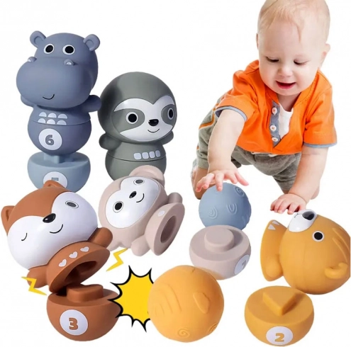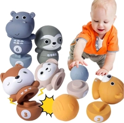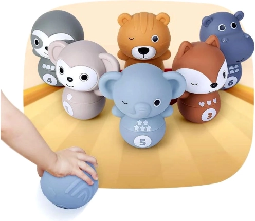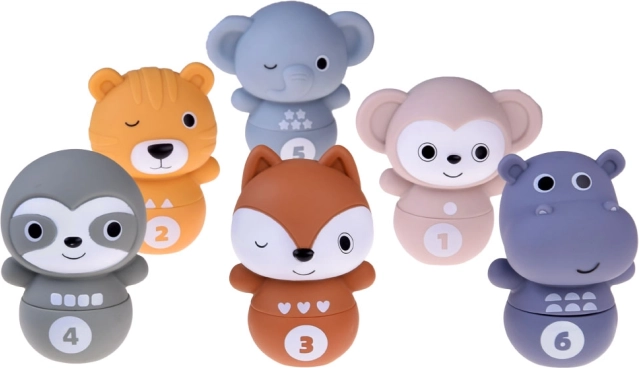 Așezați popicele una lângă alta și copiii pot doborî animalele vesele cu ajutorul unei mingi. După ce sunt răsturnate, se descompun în jumătăți, oferind o altă variație a jocului. Copiii își exersează astfel abilitățile motorii și gândirea logică prin asamblarea animalelor înapoi conform formelor și numerelor.